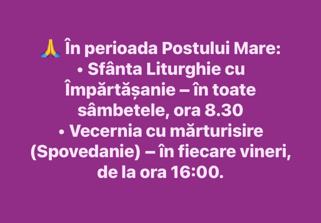 ) Sâmbătă, 27 februarie, ora 16.00 – Slujba Privegherii cu mărturisirea credincioșilor.